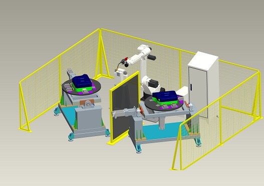 This welding robot is designed for welding steel jerrycan. Adopt 6 axis robot with Panasonic MIG welder for automatic welding. Use fixture to fix the jerrycan and ensure the location requirement for robotic automatic welding.